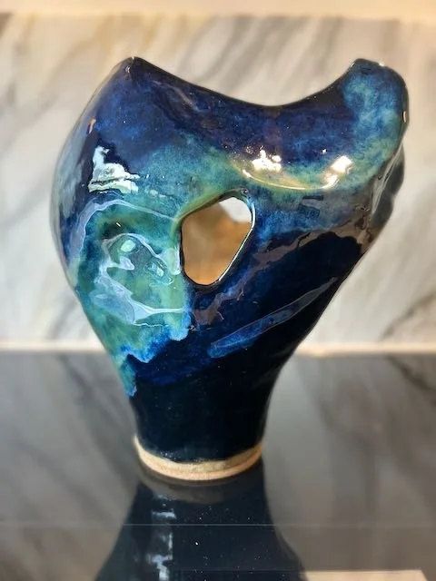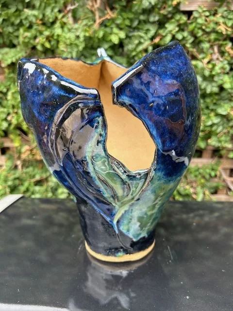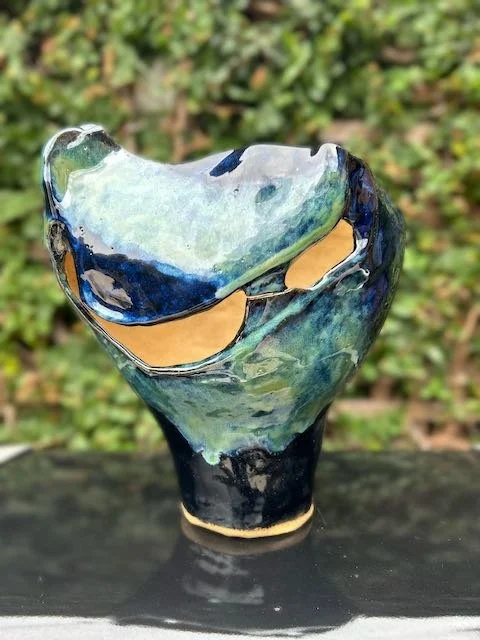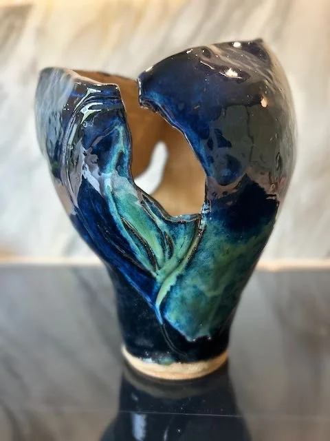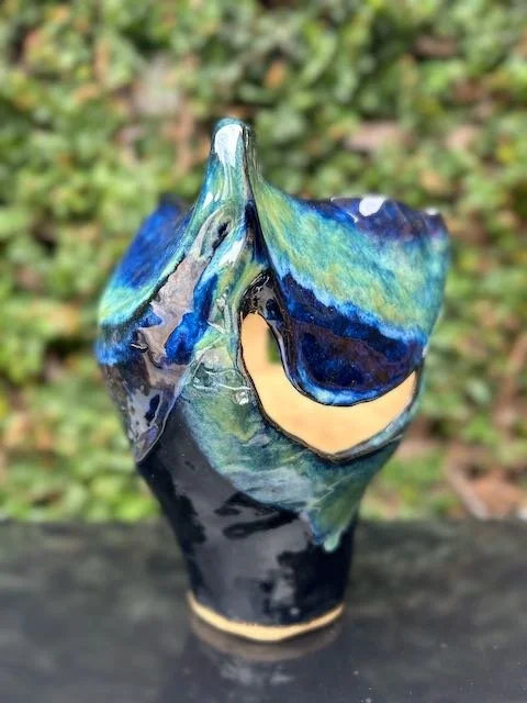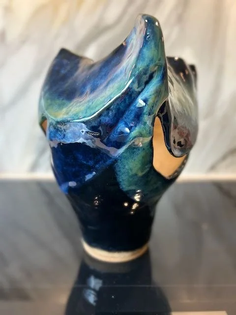In August 2025 we converted our Healdsburg garage into my home studio. I was so excited to get making that the 98 degree weather didn’t stoop me. However, I soon learned that having a fully thought out plan before rolling the first coil is essential in that kind of heat. Some of the carvings were more by necessity than design, and I dind’t think I would like this piece until it came out of the glaze kiln. The dreamy Northern Lights effect with the curves make this a stand out piece. Hand Built speckled buff clay, six glazes, fired to Cone 6 in home kiln.