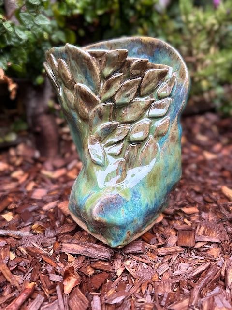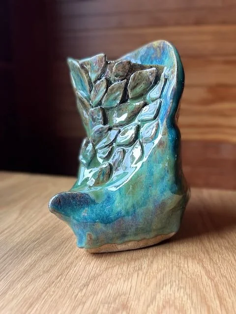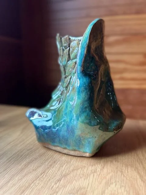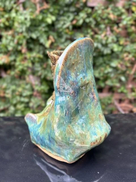 Hand Built speckled buff clay, two glazes, fired to Cone 6 in home kiln.