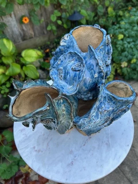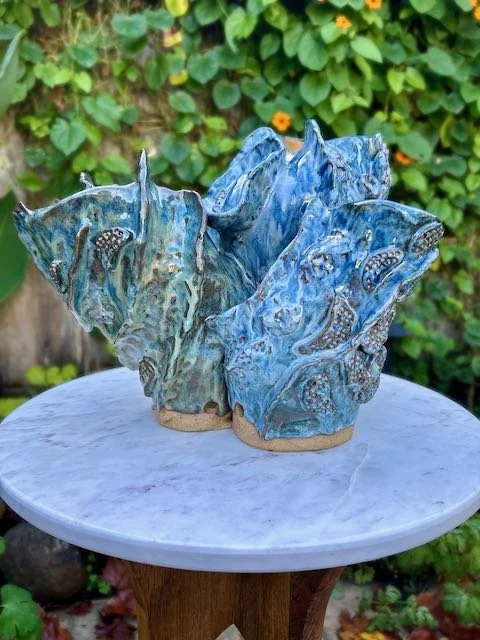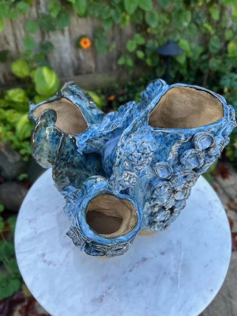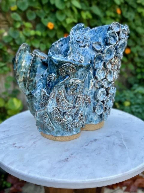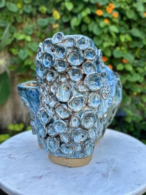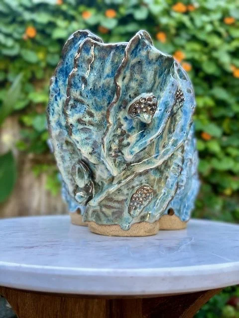 Hand Built speckled buff clay, six glazes, fired to Cone 6 in home kiln. Dimensions: 10 1/2 “x10”x14”